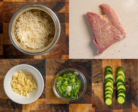 Toss salt (2 tbsp per serving) with shredded pork rind and let sit for 10 minutes. Wash pork neck, pat dry, and season with Ahh Maa Pork Seasoning. Dice garlic and spring onions, and slice cucumbers (3 mm thick) at an angle. Wash the pork rind thoroughly 2-3 times to remove salt, drain, and drip dry with a colander. Set all aside.