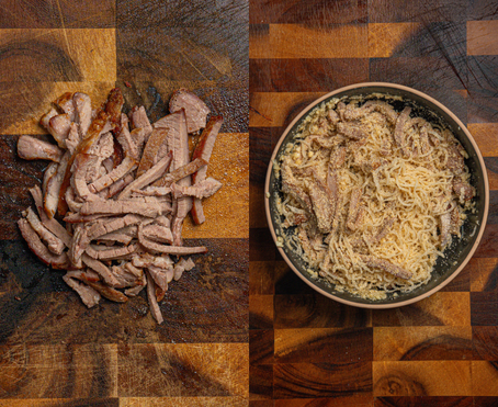 Air fry pork neck at 190°C for 15–20 minutes, turning occasionally for even and uniform cooking. Cool in the fridge, then julienne into 1–2 mm strips. In a bowl, toss julienned pork neck with minced garlic, shredded pork rind and shredded pork seasoning. Mix in Ahh Maa Grounded Roasted Rice, ensuring it’s evenly distributed. Set aside for serving.