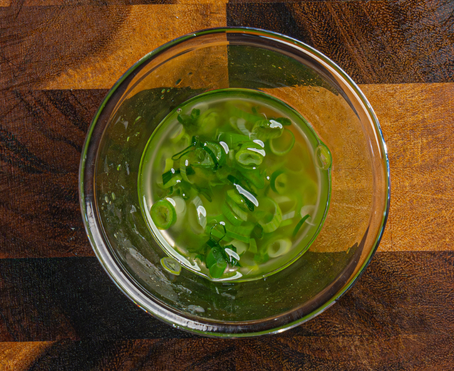 In a small bowl, microwave diced spring onions with vegetable oil (⅔ of the height of the spring onions) for 30 seconds. Set aside for serving.