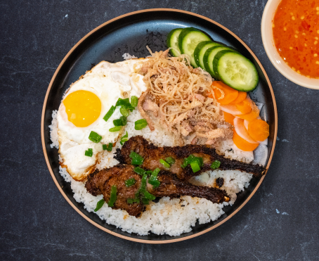 Spread broken rice on a plate and drizzle part of the scallion oil over it. Arrange the lamb cutlets, fried egg, and shredded pork on one side. Drizzle additional scallion oil over the pork and egg. Add cucumber and pickled carrot & radish on the side. Repeat this step for each serving. Serve with Vietnamese dipping sauce, drizzling generously over the dish before eating.
