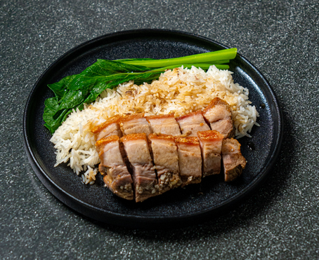 Crispy Roast Pork Belly with Rice (燒肉) is an iconic and treasured Cantonese dish from Southern China, historically symbolising prosperity and often served at feasts and banquets. The resulting flavour profile is a blend of rich, savory pork and aromatic seasonings from the garlic cloves and Ahh Maa Crispy Pork Rub. The crackling-skinned pork is plated over Jasmine rice and accompanied by fresh seasonal vegetables. The dish is then generously dressed with a drizzle of savoury Ahh Maa Roast Meat Soy Sauce. These crispy skin, the tender meat, the fragrant rice, and the fresh vegetables, combine for a perfect textural and flavour contrast, forming the basis of this classic meal.