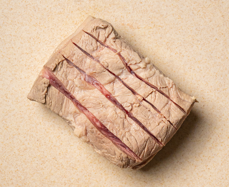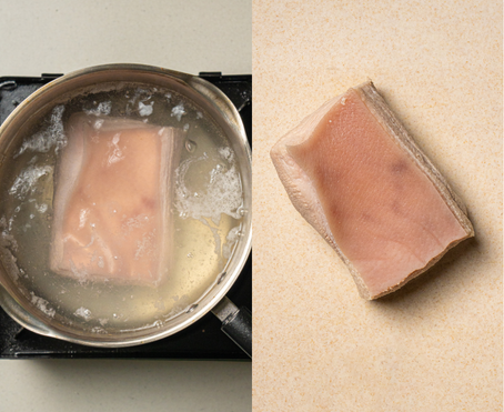 Remove the pork belly from the water and place it skin side up on a chopping board. Pat dry thoroughly with a paper towel. Using a Pork Belly Skin Crisping Tool (recommended for best results) or a knife/skewer, pierce the entire skin surface several times. Pat dry any moisture that appears. Flip the pork belly so the meat side faces up. Cut slits about 1.5 cm apart and 0.5 cm deep into the meat. These slits help the marinade absorb and guide slicing after cooking. Repeat for any additional servings.