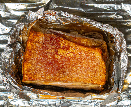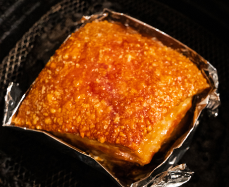 Line the bottom of the air fryer basket with foil, folding the edges flat to prevent lifting. This helps focus heat from the top of the air fryer and allows the optimal cooking process. Place the pork belly (on its foil tray) in the centre of the basket. Cook for 20 minutes at 100°C. Then increase to 200°C and cook for 40 minutes, brushing a little vegetable oil on the skin at the 5- and 20-minute marks to enhance crispiness. Remove and rest for 10 minutes before slicing.