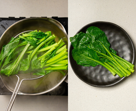 Blanch seasonal vegetables in boiling water for 30–60 seconds, or until bright green and just tender, then drain well.