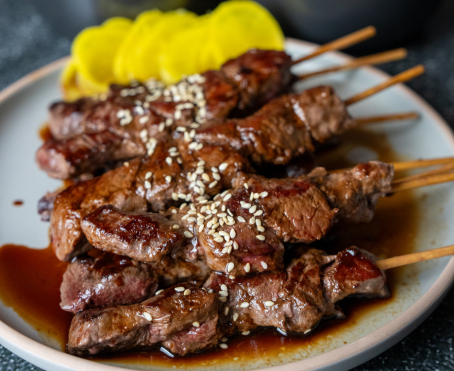 Arrange the cooked beef skewers on a serving plate. Drizzle with extra Ahh Maa Donburi Sauce and sprinkle with roasted sesame seeds.