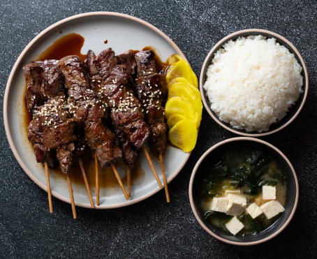 Juicy wagyu beef skewers grilled to perfection and finished with a rich, savoury donburi glaze. Each bite is tender and packed with umami, balanced by nutty roasted sesame seeds and tangy yellow pickled radish for a refreshing contrast. Served along side fluffy rice and a light miso soup with tofu and wakame, this dish delivers a comforting yet elevated Japanese-inspired meal that’s simple to cook but full of depth and flavour.