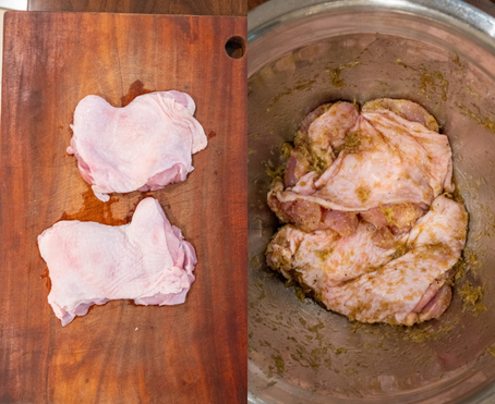 Wash chicken thighs and pat dry with paper towel. In a small bowl, combine the chicken with Ahh Maa Meat Marinade and minced lemongrass, then set aside to marinate for at least 20 minutes.
