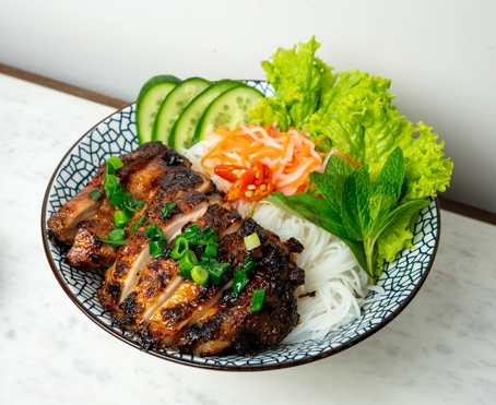 In large individual bowls (according to the number of servings) place a generous base of fresh herbs and lettuce, then layer the vermicelli on top. Arrange the cooked chicken over the noodles. Garnish with pickled vegetables, spring onion oil, and fried shallots. Serve with the prepared dipping sauce and drizzle generously before consuming.