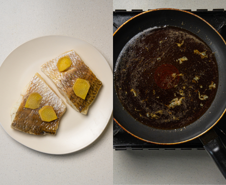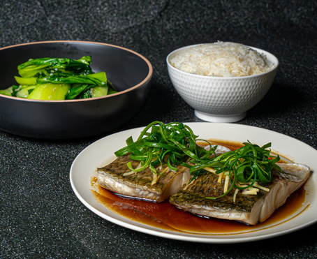Remove the ginger slices from the skin of the barramundi. Place the julienned ginger over the steamed barramundi fillets, then top with the curled spring onions. Pour the warmed soy sauce mixture evenly over the barramundi, followed by the hot oil to gently sizzle the aromatics. Serve the steamed barramundi with seasonal vegetables and steamed rice on the side.
