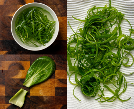 Wash all vegetables thoroughly to remove any sand or dirt. Cut spring onions into 5 cm segments, then finely julienne them into thin strands. Soak the julienned spring onions in cold water for 10 minutes to create curls, then drain and set aside for garnish. Trim the base of the seasonal vegetables and separate the stems from the leafy tops. Set aside.
