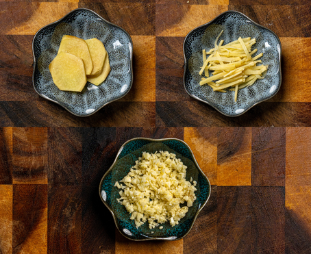 Peel the ginger and slice half of the ginger into thin slices approximately 3 mm thick (4 slices for 2 servings / 8 slices for 4 servings / 12 slices for 6 servings). Finely julienne the second half of the remaining ginger into 0.5 mm strands and set aside.