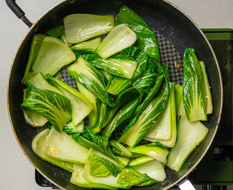 While the barramundi is steaming, in a medium pan or wok over medium-high heat, heat vegetable oil (1 Tbs for 2 servings / 2 Tbs for 4 servings / 3 Tbs for 6 servings). Add the minced garlic and sauté until fragrant and lightly golden (do not brown). Add the seasonal vegetables stems and stir-fry for 2 minutes. Add the seasonal vegetables leafy tops and Ahh Maa Vegetable Seasoning, then stir for 1 minute. Transfer to a serving plate and set aside for serving.